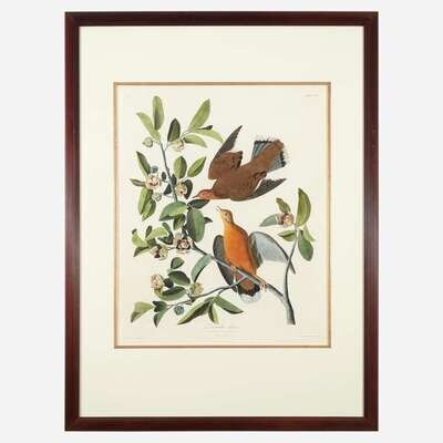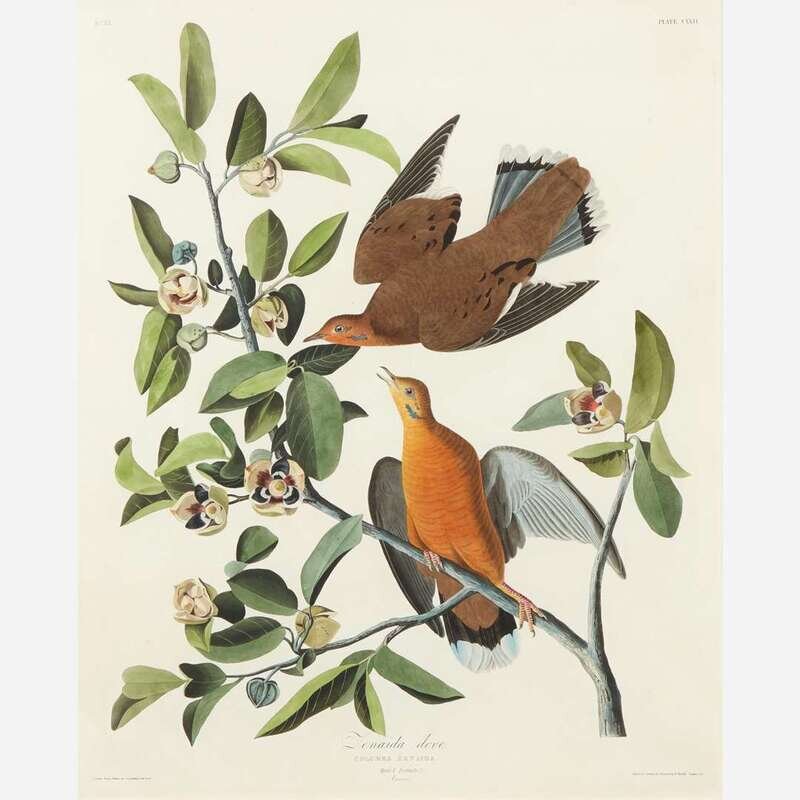 Plate CLXII from Audubon's The Birds of America (London, 1827-38). "Painting and plate depict two birds in a Pond-apple Tree. Painted in the Florida Keys in 1832. In Audubon's day this species bred in the Florida Keys; today it is accidental in south Florida. The bird was named for Princess Zenaide, wife of the eminent ornithologist, Prince Charles Lucien Bonaparte." (Susanne M. Low, A Guide to Audubon's Birds of America, p. 108)