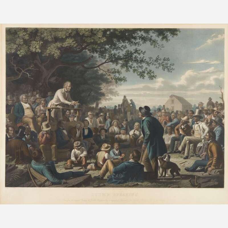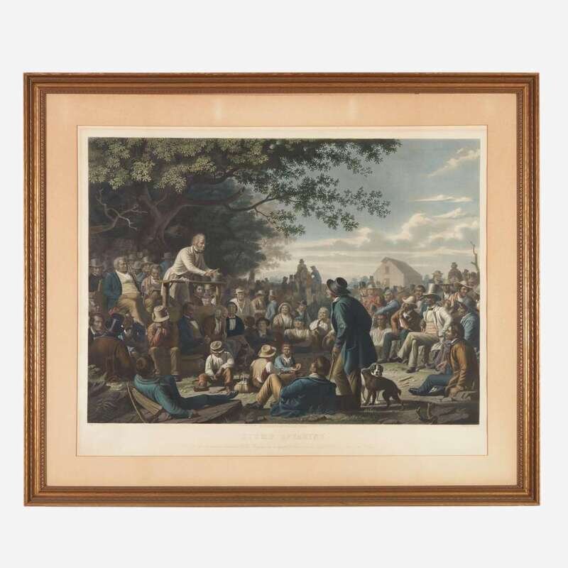 New York: Fishel, Adler, & Schwartz, 1856. Second edition. Hand-colored stipple engraving with aquatint. Engraved by Louis Adolphe Gautier after the painting by George Caleb Bingham. Mat burn in margins, scattered small spots in same; small chip at bottom center edge; pinholes in bottom corners; sheet trimmed, measuring 29 1/4 x 36 1/2 in. (74 x 93 cm). In mat and in frame, 33 x 39 1/2 in. (84 x 100 cm). Bloch, The Paintings of George Caleb Bingham: A Catalogue Raisonné, 273