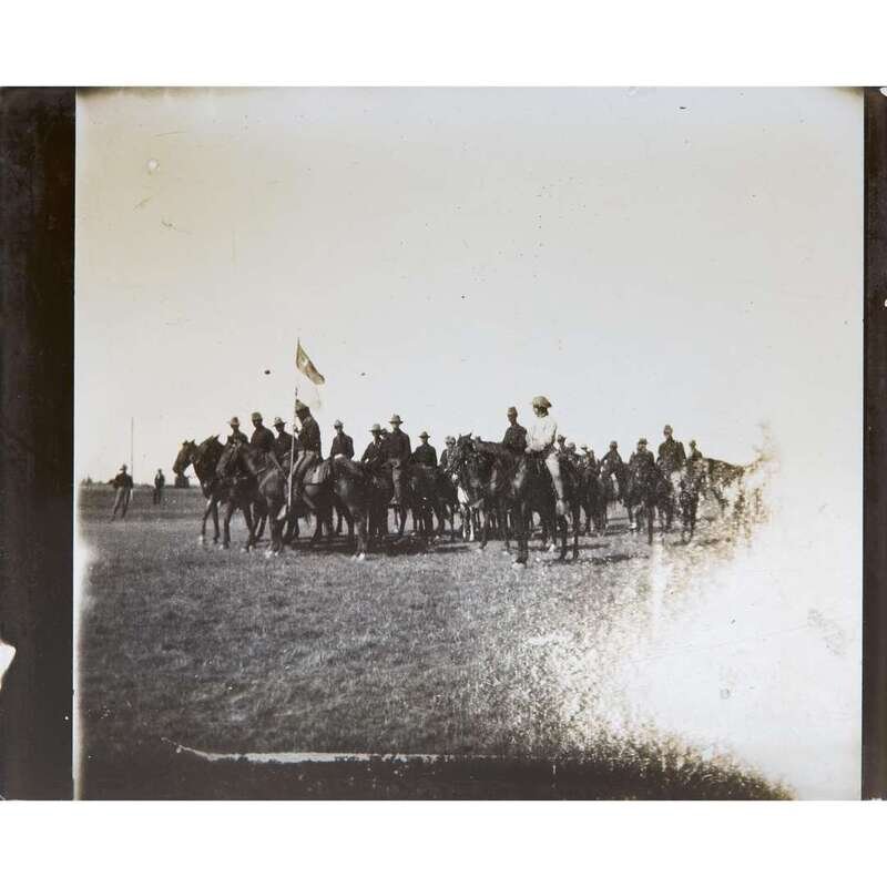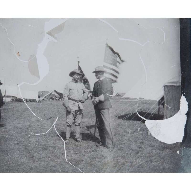 Likely Camp Wikoff at Montauk Point, New York, and Tampa, Florida, ca. 1898. Group of 54 contemporary glass lantern slides depicting American soldiers of the 1st United States Volunteer Cavalry, and others, famously remembered as the "Rough Riders," during the Spanish-American War. Each slide measuring 3 1/4 x 4 1/4 in. (82 x 108 mm). Some slides with later numbering labels; many slides worn, with glass cracked and chipped; original tape along many slide edges perished or separating, one slide with tape replaced in corners; many slides now separated into two glass sheets; numerous slides oxidizing; in wooden box.