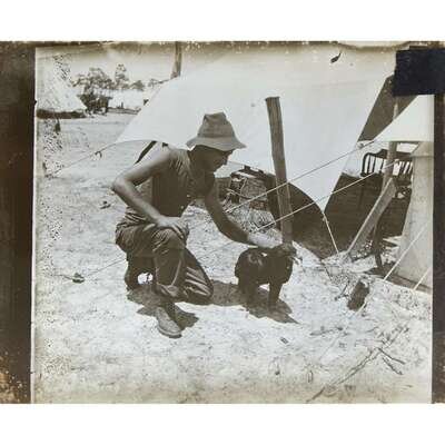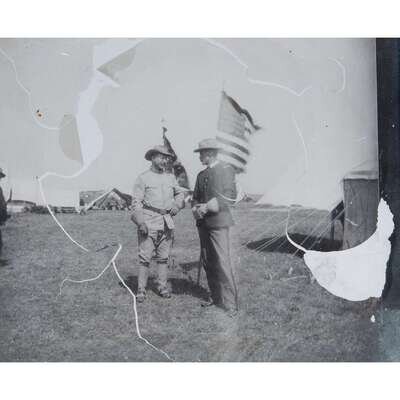 A fascinating and seemingly unrecorded collection of 54 contemporary glass lantern slides depicting the 1st United States Volunteer Cavalry who fought in the Spanish-American War (1898). Known by their nickname, the Rough Riders, they were led by future president Theodore Roosevelt (1858-1919), and are remembered for their action during the Battle of San Juan Hill in Cuba. The majority of these slides (34 of 54) depict the military quarantine encampment, Camp Wikoff, at Montauk Point, Long Island, New York, following the company's service in Cuba. The remaining 19 slides were likely taken in Tampa, Florida, the location of the company's deployment, and depict their military encampment, and include three city scenes. Roosevelt is pictured in three photographs in this collection, all likely at Camp Wikoff. In one he is seen speaking to what appears to be Lieutenant Colonel Alexander Oswald Brodie (1849-1918), in another he is pictured on horseback at the head of a cavalry unit, and in the last he is seen seated in the background while attending what is likely a church service held by Chaplain Henry A. Brown, the company's cleric. Three slides feature the company's animal mascots who were present at Camp Wikoff and in Tampa, including an eagle named in Roosevelt's honor and posed with an African American man, as well as a mountain lion named Josephine. The majority of these photographs are vernacular in nature and depict soldiers posing and congregating for the camera, some posed with guns raised. Many soldiers are pictured on horseback (one shows a soldier on a rearing horse), and some individual soldiers are present across a few slides and in various poses.