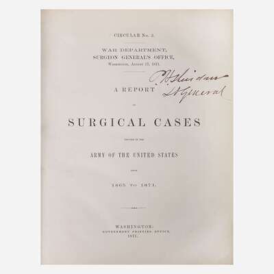 A scarce volume, issued by the Surgeon General's Office, covering various surgical and medical innovations in the United States Army in the years immediately following the Civil War, and signed by celebrated Union General, Philip Sheridan.