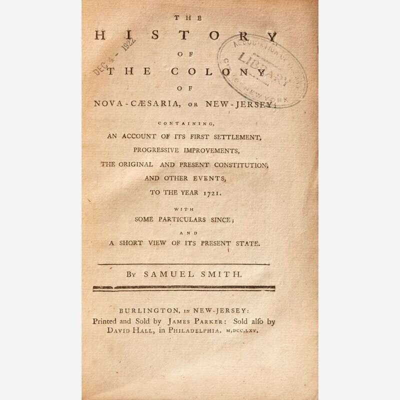 "The first history of New Jersey, printed by James Parker on a press owned by Benjamin Franklin, formerly used in Antiqua by Benjamin Mecom, and moved temporarily from New York to Burlington for the printing of this book." (Felcone 243)