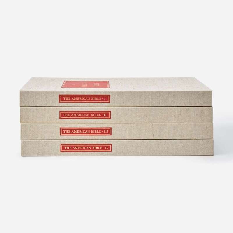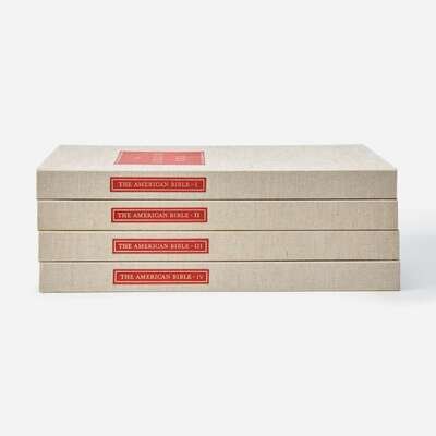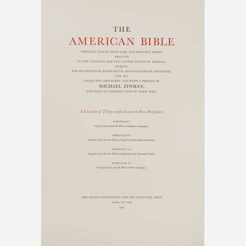 Ardsley, New York: The Haydn Foundation for the Cultural Arts, 1993. In four volumes. First and limited edition, #98 of only 100 numbered sets. Collected, described, and with a preface by Michael Zinman; introduction by Mark Noll. Comprising 38 leaves from various historic American Bibles, each loose as issued and in original large folio presentation mats with accompanying explanatory text leaves; mats housed in original large grey cloth portfolio boxes, each with gilt red morocco labels, scattered light soiling to cloth. Original printed prospectus laid in. A handsome and almost as-new set.