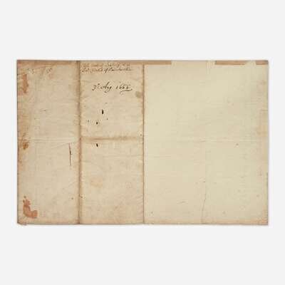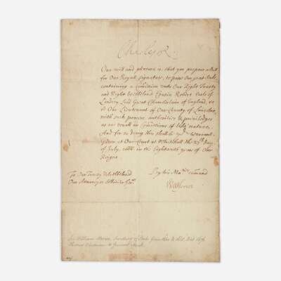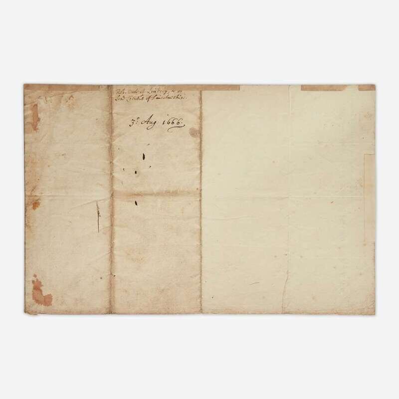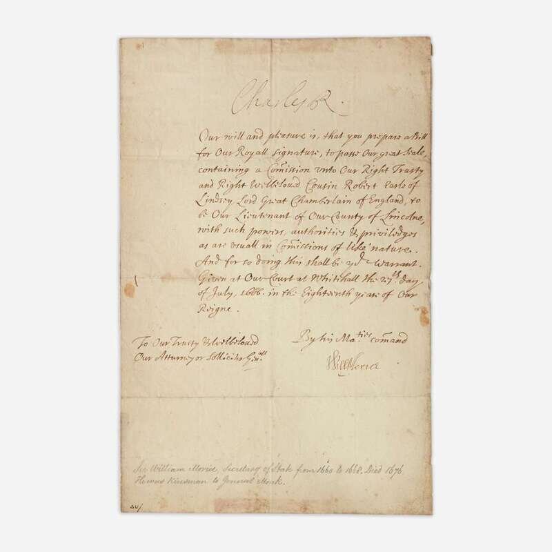 (London), July 27, 1666. One sheet folded to make four pages, 12 x 7 3/4 in. (305 x 197 mm). Manuscript letter in a secretarial hand, signed by Charles II ("Charles R") as King of England, to "Our Attorney or Sollicitor Gen'all", directing them to "prepare a Bill for our Royall signature...a Commission unto Our Right Trusty and Right Welbeloved Cousin Robert Earle of Lindsey (1630-1701) Lord Great Chamberlain of England, to be Our Lieutenant of Our County of Lincolne, with such powers, authorities & priviledges as are usuall in Comissions of like nature..."; counter-signed by Secretary of the State and Lord of the Treasury Will(iam) Morice; docketed on verso in an unknown hand, date in an additional hand "31 Aug. 1666". Creasing from contemporary folds, scattered separations to same; tape remnants and residue on verso of integral leaf; scattered spotting. Lot includes an engraved portrait of Charles II.