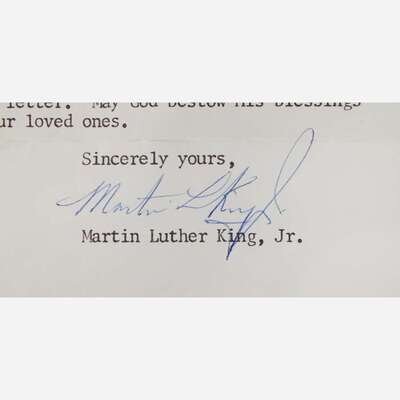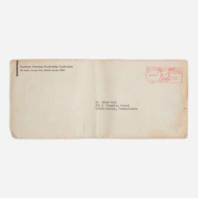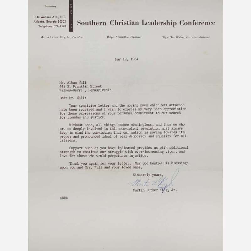 Atlanta, Georgia, May 19, 1964. One sheet, 11 x 8 1/2 in. (279 x 216 mm). Typed letter, on Southern Christian Leadership Conference (SCLC) stationery, signed by Martin Luther King, Jr., to Alban Wall of Wilkes-Barre, Pennsylvania, thanking him for his “sensitive letter and…moving poem,” and expressing his “deep appreciation for these expressions of your personal commitment to our search for freedom and justice.” Letter stapled to typed poem at top left corner, by Wall entitled "To My Black Brother"; original SCLC post-marked mailing envelope included. Creasing from original folds.