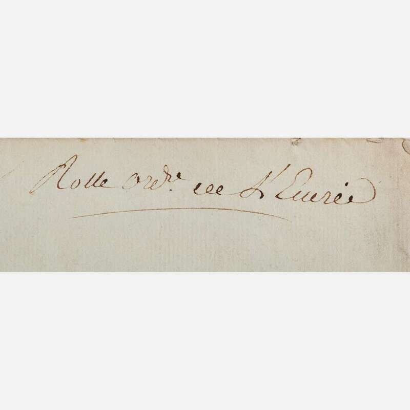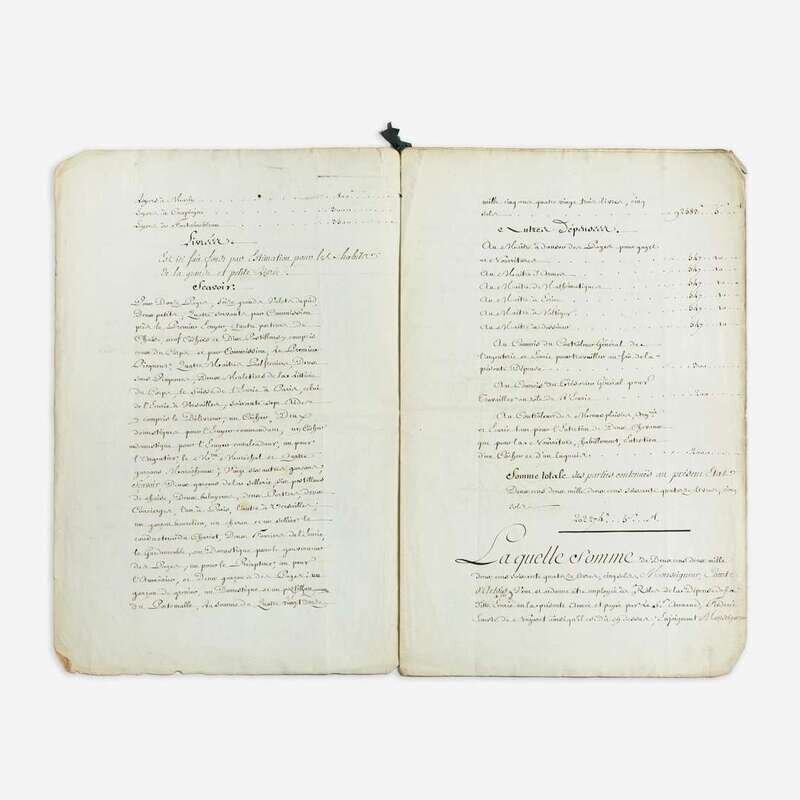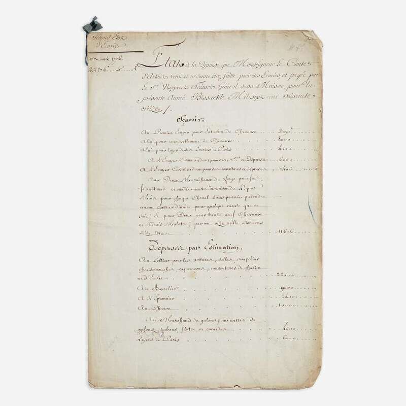 Versailles, January 1, 1776. Two sheets folded and tied with silk ribbon to make eight pages, 14 3/4 x 9 1/2 in. (375 x 241 mm). Manuscript document in French, in a secretarial hand, signed by future King Charles X of France, as Charles Phillippe, Count d'Artois, listing projected equestrian-related expenditures for the year 1776, including coaches, saddles, blankets, as well as wages for blacksmiths, squires, or other caretakers, with a total budget of $202,274 livres; counter-signed by the later Comptroller-General of Finances under King Louis XVI, Charles Laurent de Villedeuil (1742-1828). Creasing from contemporary folds, scattered separations along same; some chipping to margins; sheets lightly toned; small tear at the bottom of pages.