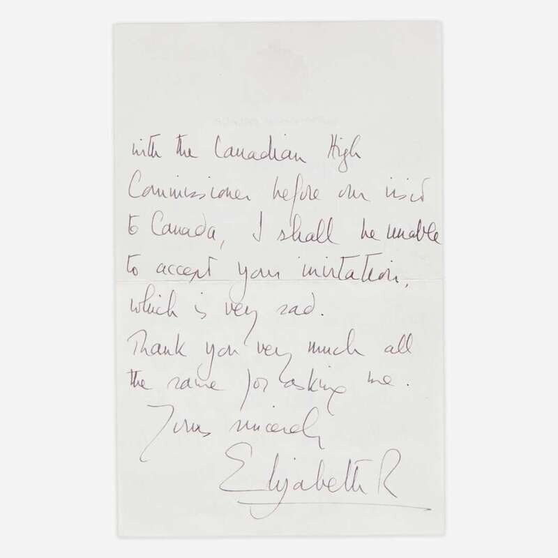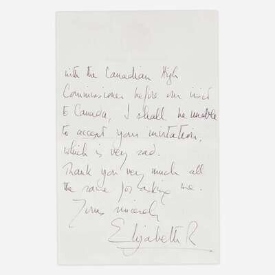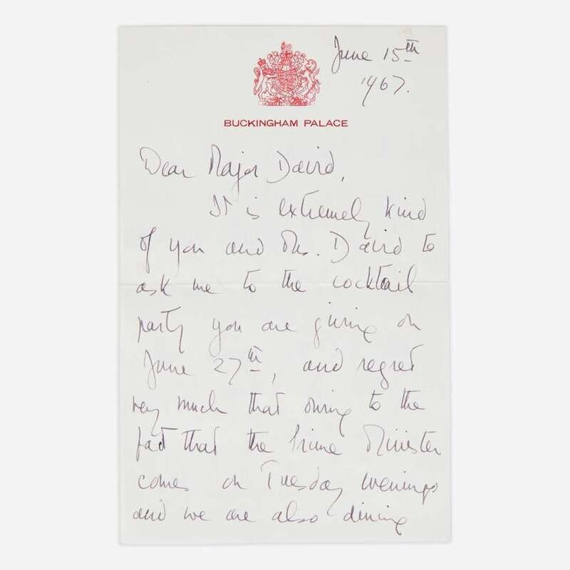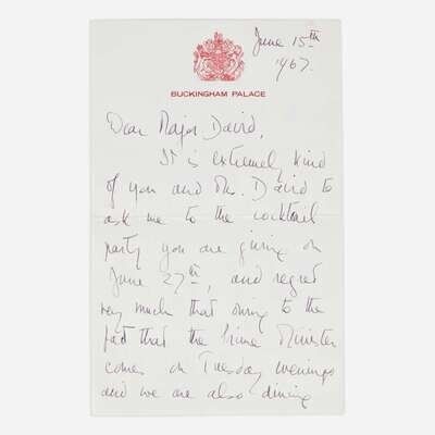 London, June 15, 1967. One sheet, 7 1/2 x 4 3/4 in. (190 x 121 mm). Autograph letter, on Buckingham Palace stationery, signed by Queen Elizabeth II, to a Major David, declining an invitation to a cocktail party later that month on account of an already planned dinner with Prime Minister Harold Wilson and the Canadian High Commissioner, Sir Henry John Bevis Lintott: "Dear Major David,/It is extremely kind/of you and Mrs. David to/ask me to the cocktail/party you are giving on/June 27th, and regret/very much that owing to the/fact that the Prime Minister/comes on Tuesday evenings/and we are also dining/with the Canadian High/Commissioner before our visit/to Canada, I shall be unable/to accept your invitation,/which is very sad./Thank you very much all/the same for asking me./Yours sincerely/Elizabeth R." Creased from original fold, and in fine condition.