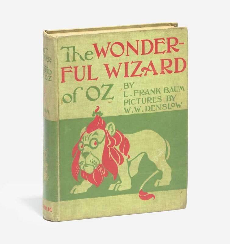 Chicago and New York: Geo. M. Hill Co., 1900. First edition, first state (with ads on p. [2] enclosed in a single-rule box; verso of title-page blank; uncorrected text; perfect type in last lines of pp. 100 and 186; earliest state of plates facing pp. 34 and 92; colophon printed in 11 lines within a double-ruled box). 8vo. 259, (3) pp. Illustrated with tipped-in color title-page, 23 tipped-in color plates, and numerous in-text illustrations in various color shadings, by W.W. Denslow. Original second state green pictorial cloth, with publisher's imprint at foot of spine stamped in red unserifed type, boards stamped in green and red, boards and spine lightly soiled and rubbed; all edges stained yellow; pictorial grey-tone front paste-down and pictorial red and black pictorial rear past-down, as issued; gutter exposed between signatures in the following places, pp. 32-33, (64-65), 96-(97), 112-113, 128-129, 144-145, and at pp.161 and (177); plates facing pp. 12 and 220 slightly loose; scattered minor soiling in text edges; green ink stamp of previous owner on front fly leaf; in quarter morocco slip case and chemise. Hanff & Green I.1, binding state B (binding state A is associated with the earliest presentation copies and is excessively rare).