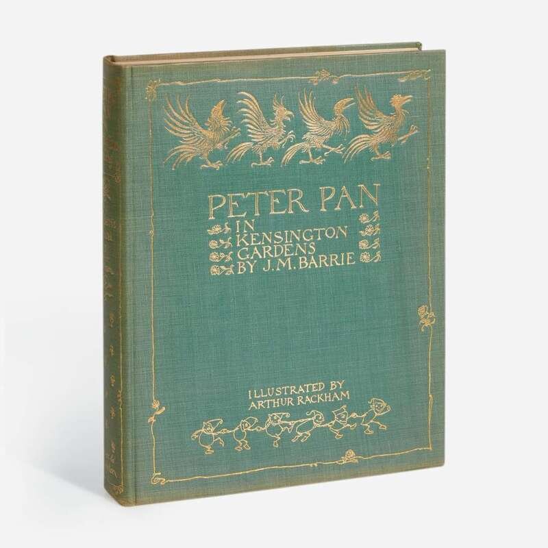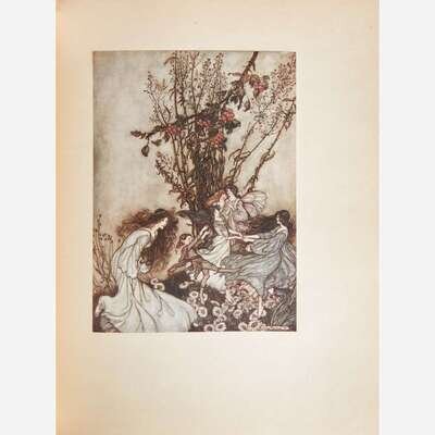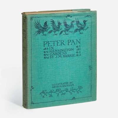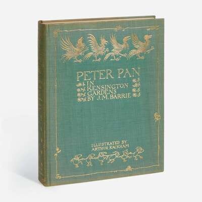 London: Hodder & Stoughton, (1912). New Edition. 4to. Illustrated with tipped-in color frontispiece, 49 tipped-in color plates, and 22 black and white in-text illustrations, by Arthur Rackham; each color plate with captioned tissue guard. Original green cloth, stamped in gilt, spine and board edges faded; top edge trimmed, other edges untrimmed; in original unclipped dust-jacket, wear along top and bottom edges, tape repairs verso, spine slightly faded; old ownership signature at top of front free endpaper. Riall, pp. 114-115; Latimore & Haskell. p. 40.