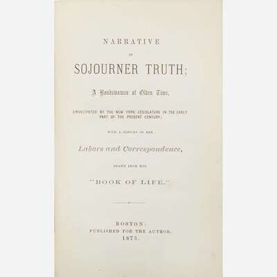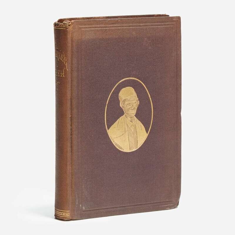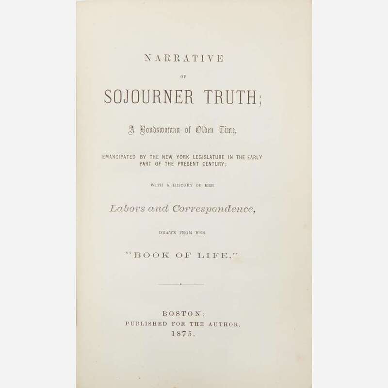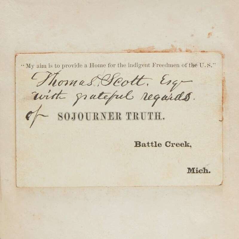 Boston: Published for the Author, 1875. Two parts in one volume. First revised edition of Narrative of Sojourner Truth, and first edition of "Book of Life." 8vo. 320 pp. With Truth's printed Battle Creek, Michigan calling card mounted to front paste-down, inscribed to American railroad executive and industrialist, Thomas A. Scott: "Thomas Scott, Esq/with grateful regards of" (possibly in the hand of Truth's secretary, tour manager, and editor of this volume, Frances W. Titus, ca. 1878-79) before Truth's printed name. Illustrated with frontispiece portrait of Truth, with original tissue guard. Original brown cloth with portrait of Sojourner Truth, stamped in blind and in gilt, spine lettered in gilt, head of spine chipped, spine and boards unevenly faded, slight bubbling to rear board cloth; all edges trimmed; offsetting from card onto front free endpaper. Blockson 3435