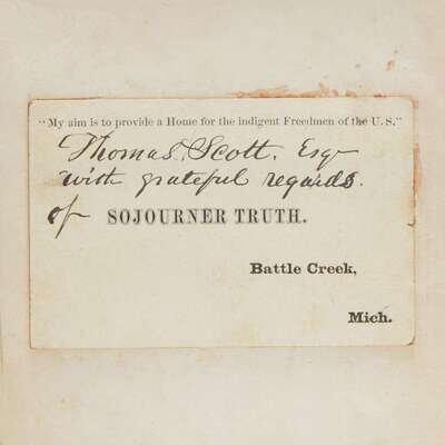 While the inscription on Truth's calling card mounted in this volume is undated, it is known that she and Titus travelled together on a six-month speaking tour in New York, and along the East Coast, in 1878-79. As Titus acted as Truth's defacto tour manager and secretary at this time, and due to Truth's illiteracy, it is possible that this card was inscribed by Titus for Scott during one of Truth's stops.