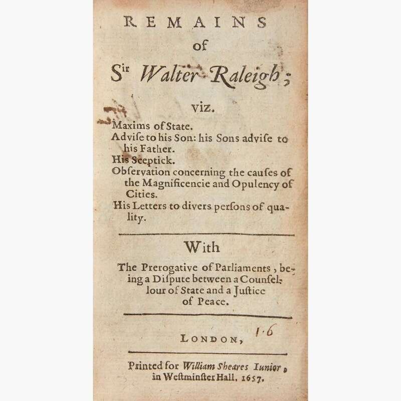A rare 1657 edition of Sir Walter Raleigh's collected writings. "The Remains of Sir Walter Raleigh was, undoubtedly, next to the History of the World, the most popular and the most frequently reprinted of Sir Walter's works. The date of the first edition has proved somewhat of a stumbling block to bibliographers. Lowndes assigns it to 1660, and Watts to 1661, but its publication took place several years earlier. The first edition appeared in 1651, and had no distinctive name, the title-page containing simply a list of principle contents. The same may be said of the next published in 1656. The third, issued in 1657, bore for the first time a special title, Remains of Sir Walter Raleigh, which it retained through all the subsequent editions." (T.N. Brushfield, The Bibliography of the "History of the World" and of the "Remains" of Sir Walter Ralegh, 1977, pp. 4-5). Brushfield records nine editions, published in 1651, 1656, 1657, 1661, 1664, 1669, 1675, 1681, and 1702. He further notes that the first three editions feature varying changes in content, while editions after 1661 remain the same.