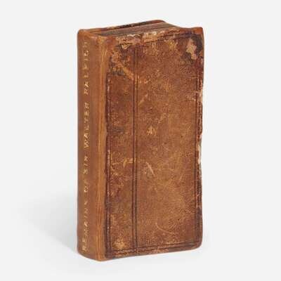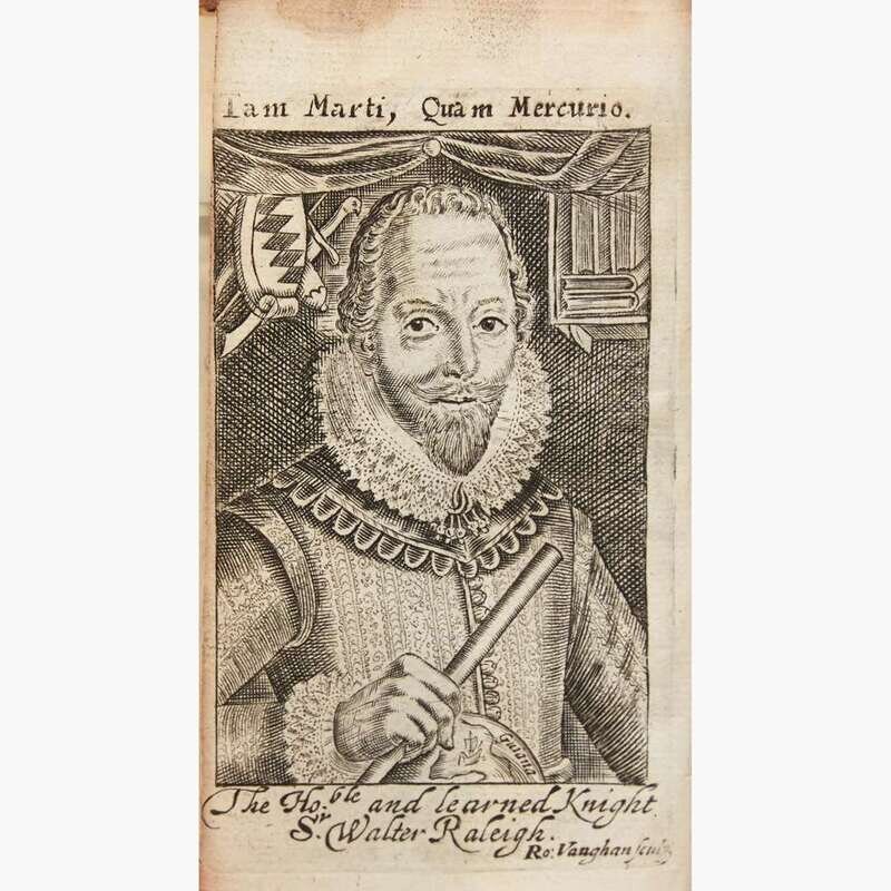 London: Printed for William Sheares Junior, 1657. 12mo. (x), 202, (12), 122 pp. Illustrated with an engraved portrait frontispiece of Raleigh by Robert Vaughan. Contemporary full brown calf, stamped in blind, rebacked, spine stamped in gilt, extremities and boards rubbed and scratched, two holes on rear board from removed hardware; all edges trimmed; engraved view of Raleigh's birthplace mounted to front paste-down, additional view tipped-in to same; old gift inscription on verso title-page; waste-paper from a work by Erasmus inserted at rear. Brushfield, pp. 4-8; Sabin 67577; ESTC R20762