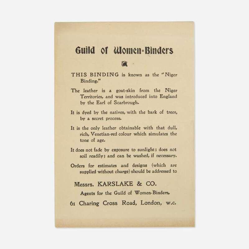 The Guild of Women-Binders was established by London bookseller Frank Karslake in 1898 with the purpose of training, promoting and selling the works of women bookbinders. Karslake was inspired to start the guild after attending the Victorian Era Exhibition at Earl's Court in 1897 where he encountered the work of several women binders, including that of Annie MacDonald. MacDonald encouraged Karslake to start the venture and to act as their agent to promote and sell their work. In the months that followed he organized a successful show at his Charing Cross bookshop, "The Exhibition of Artistic Book-bindings by Women," and then established a school to train women in the process of tooling and finishing. Several notable binders were affiliated with the Guild, including MacDonald, Helen Schofield, Phoebe Traquair, and Florence de Rheims, among several others, including Karslake's two daughters, Constance and Olive Karslake. Although an important moment in the history of English bookbinding, it was short-lived, and due to a variety of reasons--from a lack of adequate staffing and proper training to accusations that the bindings were actually the work of Karslake's Hampstead Bindery--the Guild folded in 1904.