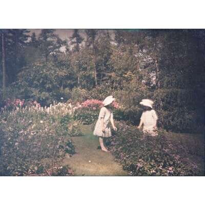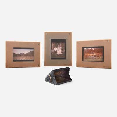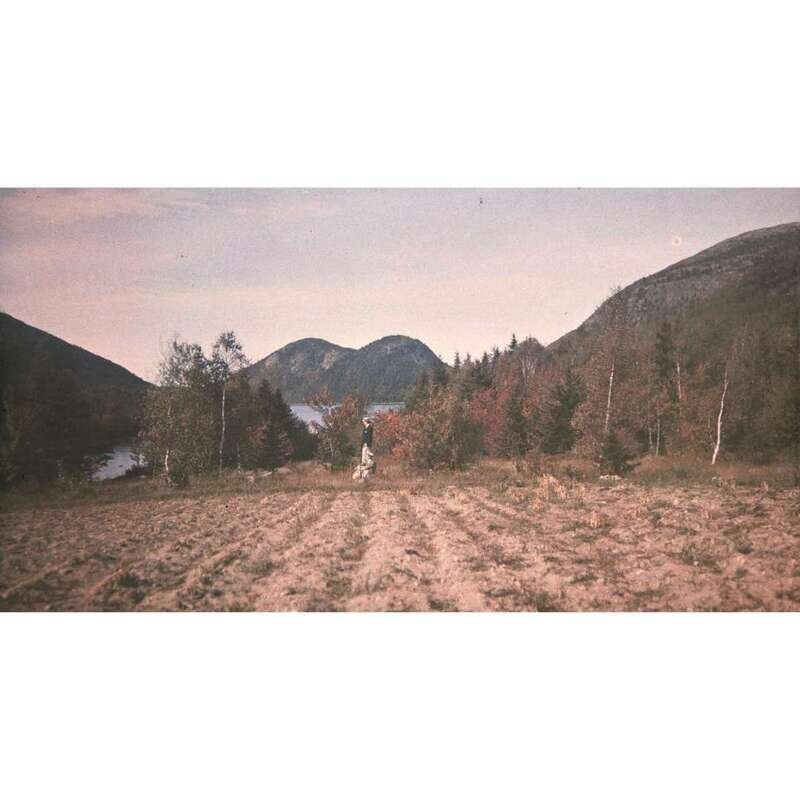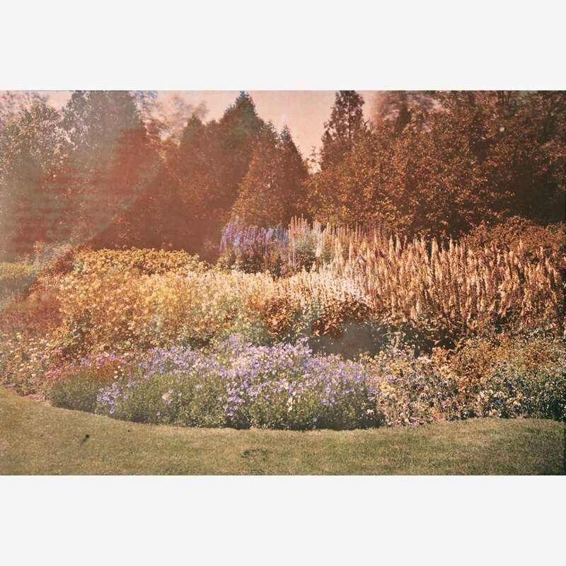 Lyon: A. Lumiere & Ses Fils, ca. 1912. Group of four autochromes, depicting members of the Edgar T. Scott family. Three of which are set in American landscape architect Beatrix Farrand-designed gardens at their summer estate Chiltern, in Bar Harbor, Maine. The fourth depicts the iconic view from Jordan Pond House in Seal Harbor, Maine. Three plates in passe-partout paper-frames, by R. Dechavannes, Paris, and with Lumiere imprint at bottom; metal studs in top corners; each measuring 10 7/8 x 8 1/2 in. (276 x 216 mm); one smaller autochrome in an L.A. Dubernet No. 4 diascope viewer, measuring 4 5/8 x 5 5/8 in. (117 x 143 mm).