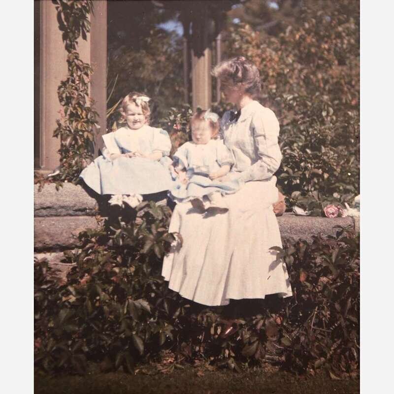 Three slides depict members of the Scott family in Farrand's gardens: the smaller one, in the diascope viewer, likely depicts Anna Dyke Scott (later Mrs. Moorhead C. Kennedy) on the right and Susan Sturgis Scott (later Mrs. Alexander B. Wheeler) on the left in Farrand's gardens, ca. 1912. One Lumiere slides depicts a young Anna Scott on the left and Susan (Susie) Scott in the center on the lap of their mother Mary (Maisie) Howard Sturgis Scott, wife of Edgar T. Scott, ca. 1909. The second Lumiere slide depicts a view of Farrand's gardens, and the third Lumiere slide depicts the Jordan Pond House in Seal Harbor, Maine, a popular tea house during the Gilded Age, located less than ten miles from Bar Harbor, and now a popular restaurant in Acadia National Park.