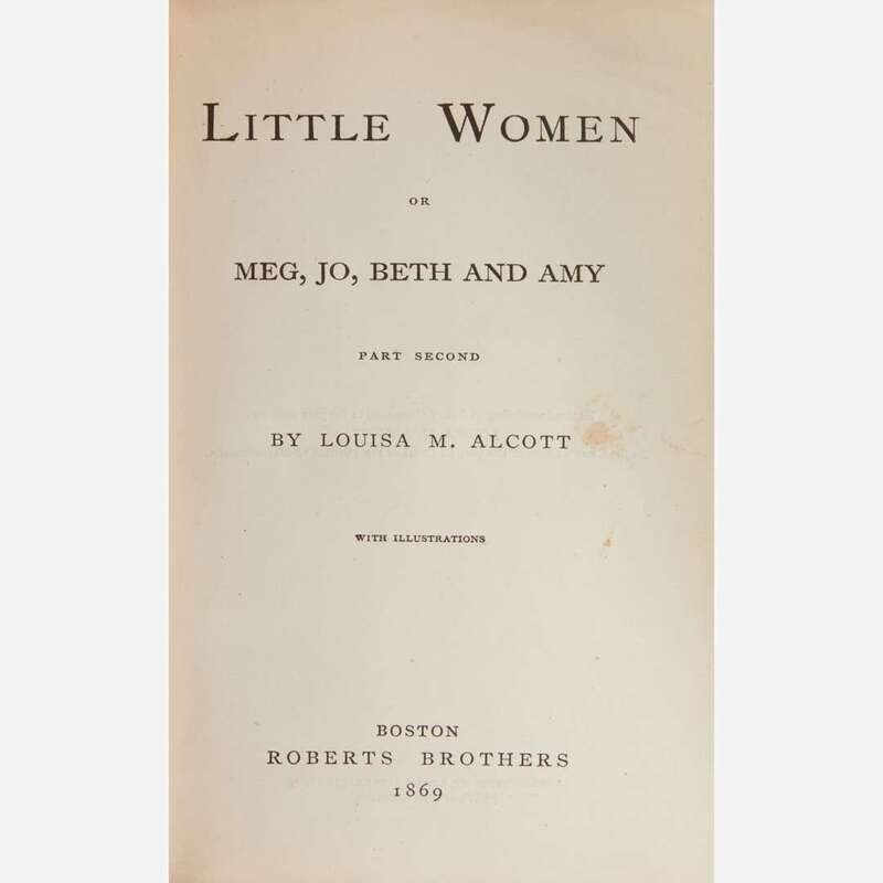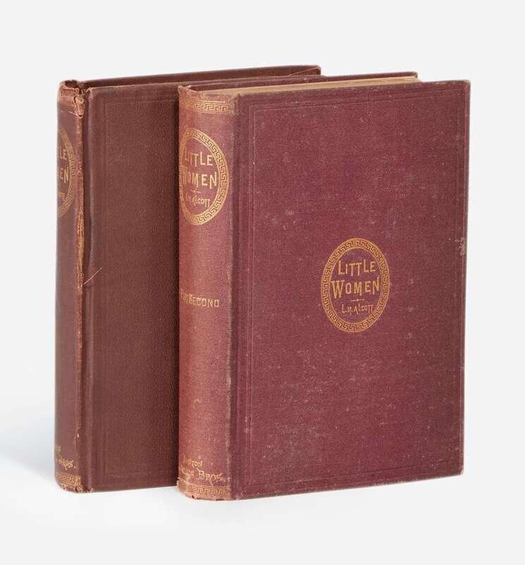 Boston: Roberts Brothers, 1868-69. In two volumes. First edition, first state (with $1.25 price in terminal ad in first book, and no notice for Little Women, Part First at end of contents on p. iv in second book). 8vo. 341, (1), (6) (ads); 359, (1), (8) (ads) pp. First book illustrated with frontispiece and three plates by May Alcott; second book illustrated with frontispiece and three plates by various artists. First book in original terra cotta cloth, second book in original purple cloth, each stamped in blind and in gilt, first book misbound with text block cased upside-down, each volume cocked, joints on each volume rubbed, tear along front joint of first book, two stains to front board of same, extremities variously rubbed in both volumes, spine of second book lightly faded; all edges trimmed; brown-coated endpapers; front and rear hinges of first book cracked and starting; front and rear hinges of second book worn; some gatherings starting in each volume; bookseller's embossed stamp at top of front free endpaper in first book; bottom corner, pp. 35/36 chipped and torn in first book, scattered creasing to top corners in same; old ownership signature in pencil on front blank in second book; each volume in quarter morocco slip case and chemise. BAL 158 and 159; Peter Parley to Penrod, p. 30; Grolier American 74