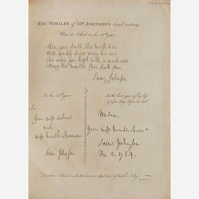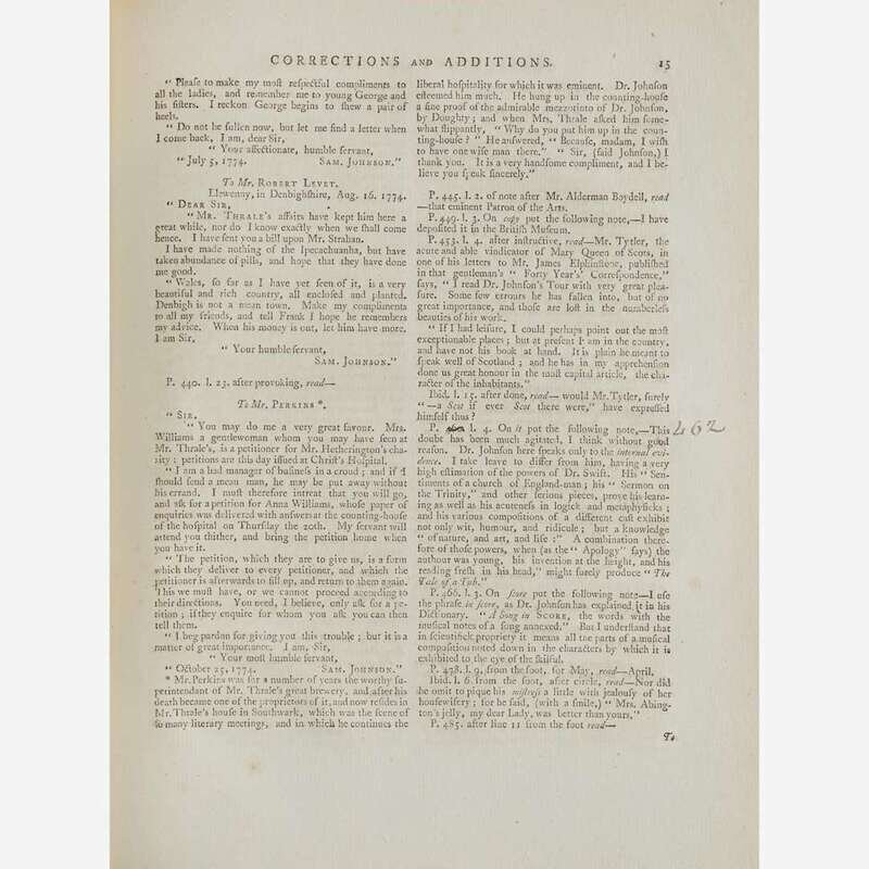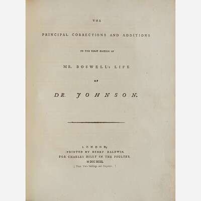 First edition of Boswell's landmark biography, including the scarce first edition of Principal Corrections, Boswell's final publication before his death. Principal Corrections was published simultaneously with the second edition of The Life of Samuel Johnson and was intended as a supplement for owners of the first edition, providing additional material such as letters and anecdotes that were given to Boswell following the first edition's publication.