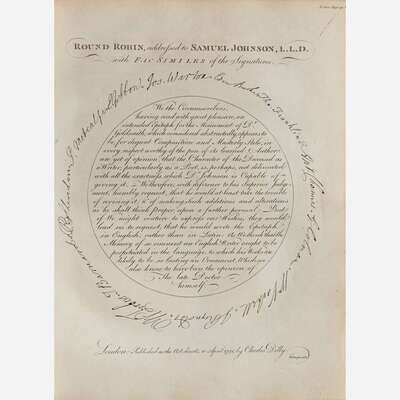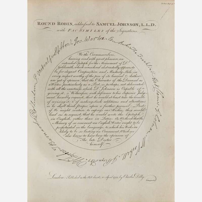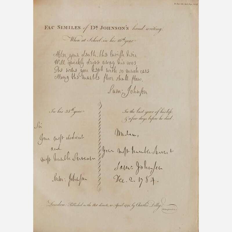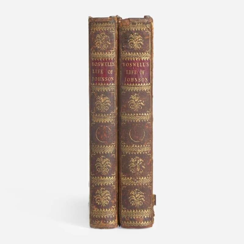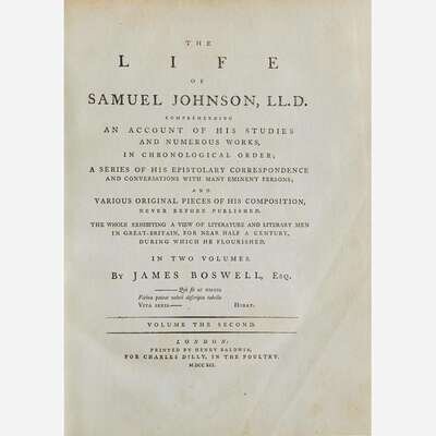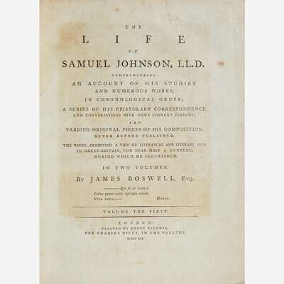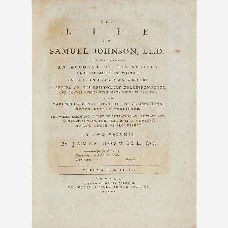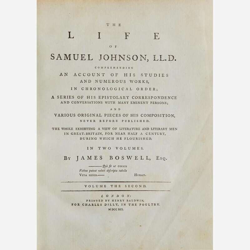 London: Printed by Henry Baldwin for Charles Dilly, 1791. In two volumes. First edition, first issue (with "gve" on line 10, p. 135, in first volume). 4to. xii, (xvi), 516; (ii), 588 (some pages misnumbered); (ii), 42 pp. Second volume bound with the scarce The Principal Corrections and Additions to the First Edition of Mr. Boswell's Life of Dr. Johnson (London: Printed by Henry Baldwin for Charles Dilly, 1793); with ten contemporary manuscript corrections in ink: eight to page numbers and two to typographical errors (another copy of this title was sold in 2019 by Dominic Winter with corrections in a similar hand). Illustrated with an engraved portrait frontispiece of Johnson by J. Heath after Sir Joshua Reynolds, in first volume; engraved "Round Robin" plate facing p. 92, and the engraved plate with facsimile of Johnson's handwriting, facing final page of Principle Corrections, in second volume. Full contemporary tree calf, stamped in gilt, rebacked, original spine laid down, red morocco spine labels, rear board on second volume detached, front board on same starting, boards and extremities to each rubbed; scattered foxing to text leaves; closed tear at bottom, pp. 195/196 in first volume. From the library of New York philanthropists and book collectors, Clara and Irwin Strasburger, with their black morocco book-plate on front paste-down of first volume (perished in second volume); additional book-plate of Henry Sterry on each front paste-down. ESTC T064481; Grolier, English 65; Rothschild 463 and 466; Pottle 79