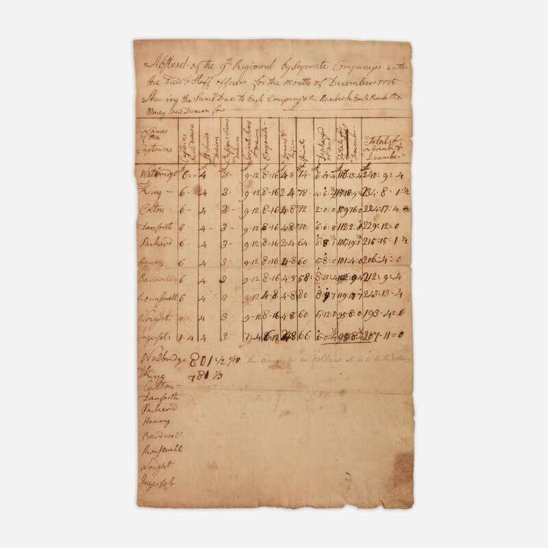 (Massachusetts), ca. January, 1776. One sheet, 12 1/2 x 7 1/2 in. (317 x 190 mm). Manuscript document, in an unknown hand, being an "Abstract of the 9th Regiment by Seperate Companyes (sic) with the Field & Staff officers for the month of December 1775. Shewing the Sums Due to Each Company & the Numbers In Each Rank the Money was Drawn for." Comprising a MS. chart in 11 columns, listing: "Names of the Captains," "Captains Sums Drawn," "Lt Sums Drawn," "Ensigns Sums Drawn," "Serjents (sic) Sums Drawn," Corporals--," "Drums & Fifes," "Privets," "Discharged or Dead," "Totals for December," and "Totals for November & December." Ten Captains are listed, including: (Homes) Walbridge, (Josiah) King, (Charles) Colton, (Jonathan) Danforth, (John) Packard, (Malcolm) Henry, (Jonathan) Bardwell, (Levi) Rounsevell, (John) Wright (2nd Lieutenant), and (Peter) Ingersoll. Creasing from contemporary folds, small separations along same; sheet unevenly toned. See Heitman, Historical Register of Officers of the Continental Army During the War of the Revolution, April, 1775, to December, 1783 (Washington, D.C. 1893)