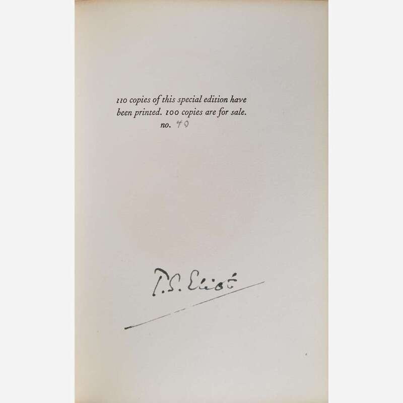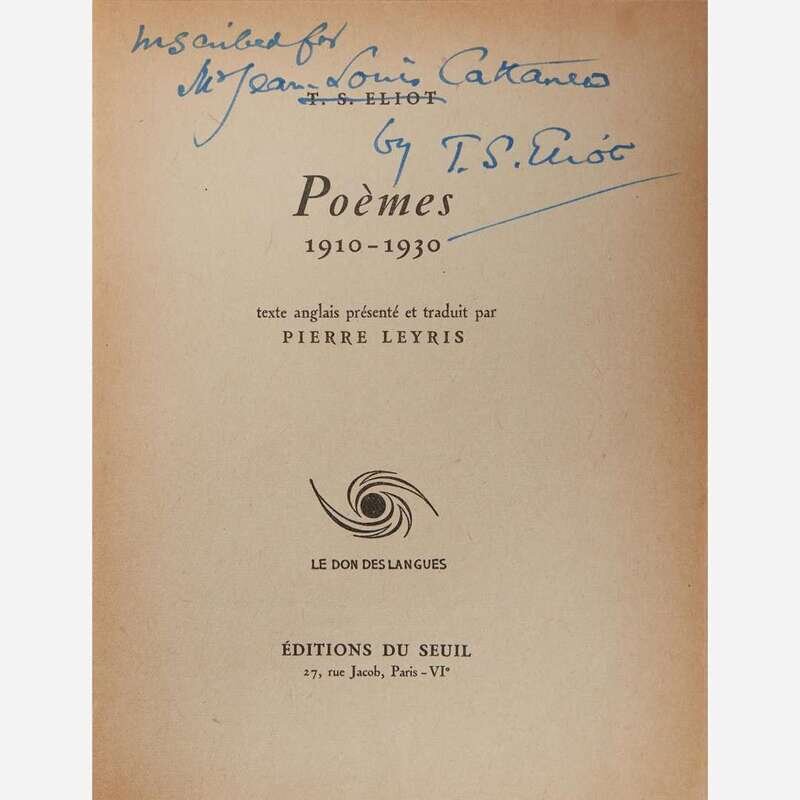 Paris: Editions du Seuil, (1947). 12mo. 215, (9) pp. Inscribed by Eliot on title-page: “Inscribed for/Mr. Jean-Louis Cattanes/by T.S. Eliot”; author’s printed name on same crossed out by Eliot. Printed in French and in English. Original limp printed wrappers; all edges untrimmed; ownership signature at top of front free endpaper. Gallup D87