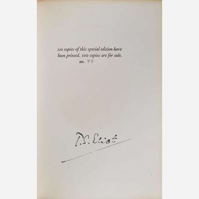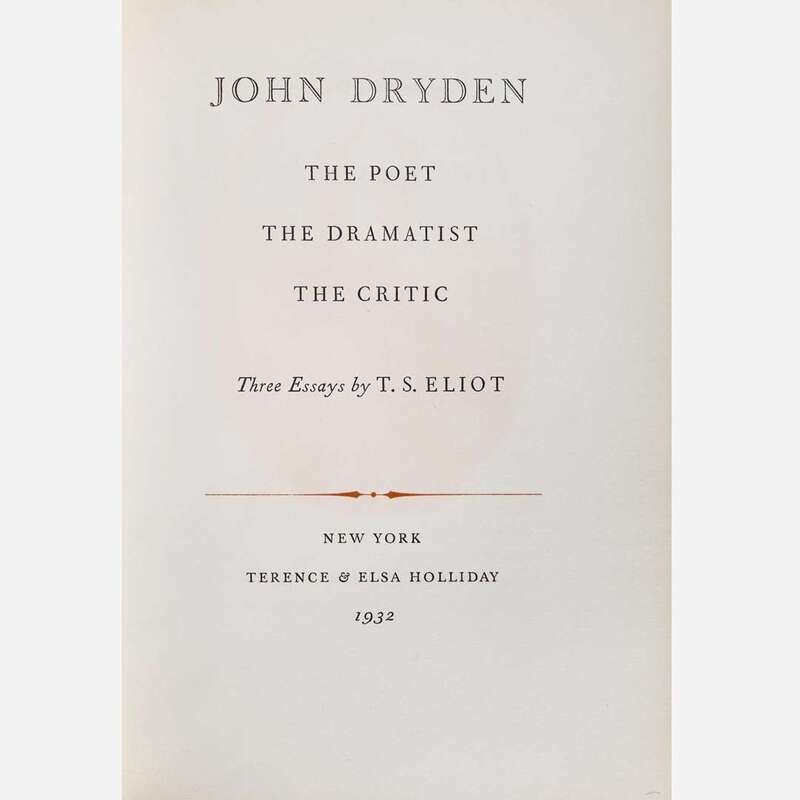 New York: Terence & Elsa Holliday, 1932. First and limited edition, #40/110 copies signed by Eliot. 8vo. (ii), 67, (1) pp. Illustrated with a frontispiece portrait of Dryden. Original quarter cloth over marbled paper-covered boards, stamped in gilt; top edge gilt, other edges trimmed; book-plate on front paste-down. Gallup A22b