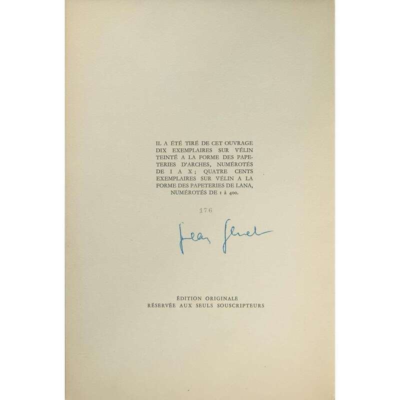 (Genève): Aux dépens d'un ami, (1949). Limited edition ("Edition Originale Reserve Aux Seuls Souscripteurs"), #176/400 copies signed by Genet, on Arches wove paper (from a total edition of 410). Folio. 309, (3) pp. Gatherings loose as issued in printed paper chemise with original glassine, scattered wear and short tears; sheets largely unopened; in original board slip case, bottom panel separated.