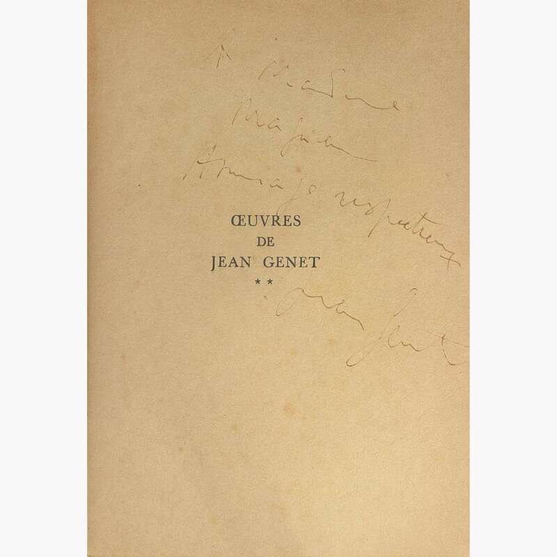 (Paris): Gallimard, (1951). Review copy, "S.P." (service de presse), printed at bottom of title-page. 8vo. 402, (2) pp. Affectionately inscribed by Genet on half-title to Madeleine, who a previous cataloguer suggested was French actress and theater producer, Madeleine Renaud: "A Madeleine/Ma jolie/Homage respectueux/Jean Genet". Original stiff printed wrappers, toned; in original glassine dust-jacket; text toned with scattered minor foxing; inscription slightly faded; front hinge cracking.