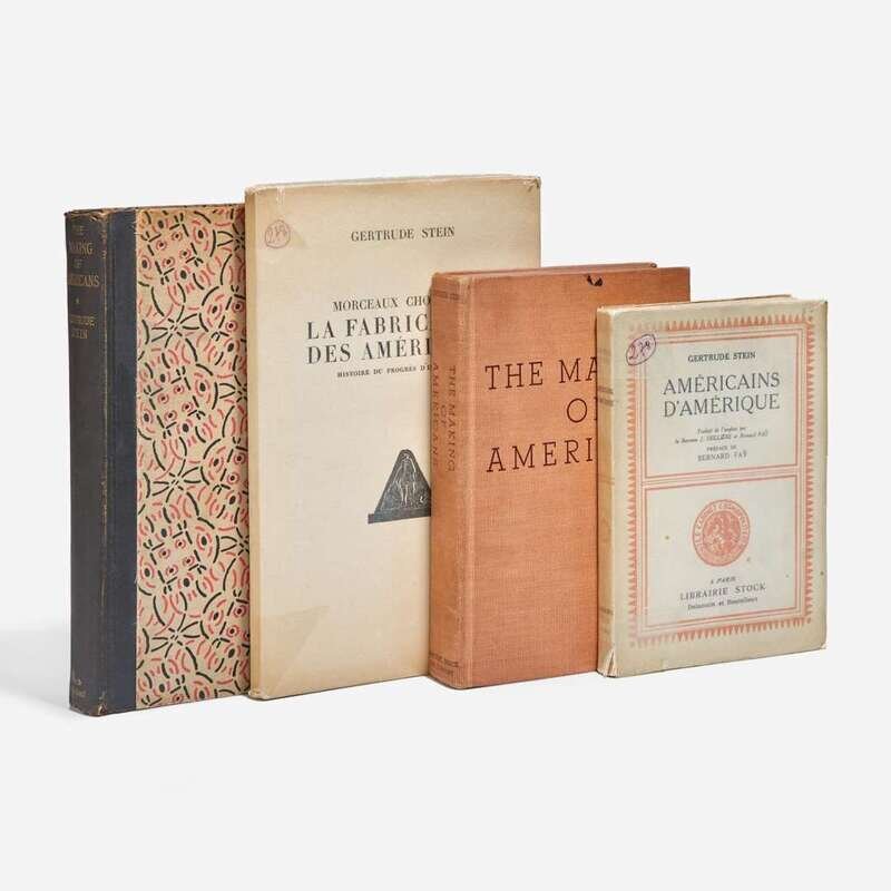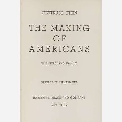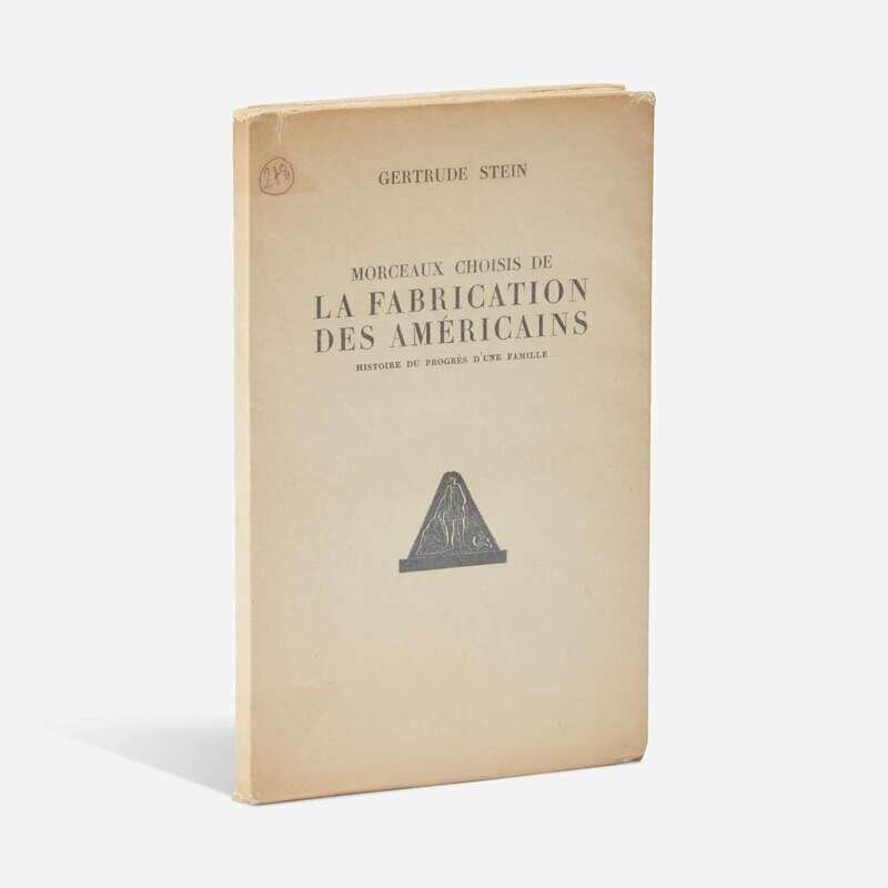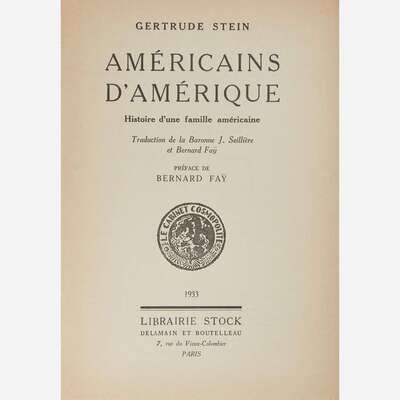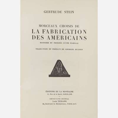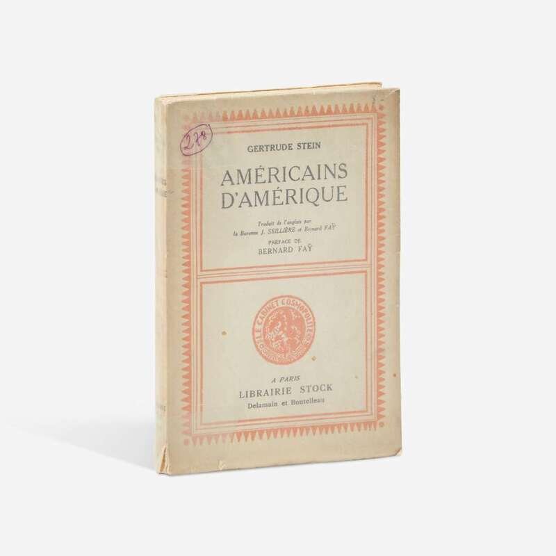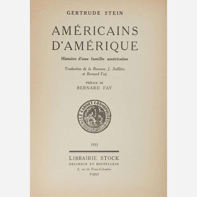 Paris: Librairie Stock, 1933. Second edition in French, #289/2,200 numbered copies. 8vo. 260, (6) pp. Signed by Stein on half-title, and inscribed by the translator, Bernard Fay, on same. Translated by the Baroness J. Seillere and Fay; Preface by Fay. Original stiff printed cream wrappers; top edge trimmed, other edges untrimmed; in original glassine, same ink notation as above copy on front panel. Wilson D6