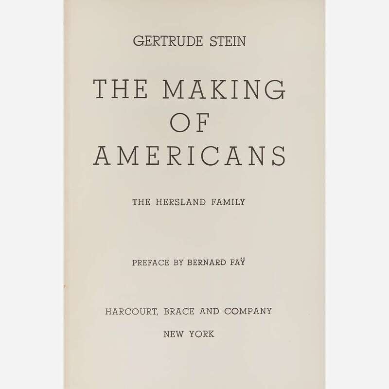 New York: Harcourt, Brace and Company, (1934). First abridged edition, second printing (February, 1934). 8vo. Xxiii, (i), 416 pp. Signed and dated by Stein a month after this printing, "March '34", on front free endpaper. Original light orange cloth, stamped in dark red, scattered light soiling to boards; top edge stained red, other edges trimmed; dust-jacket wanting. Wilson A6