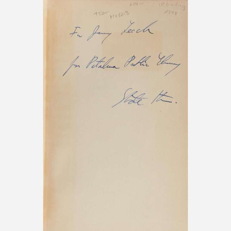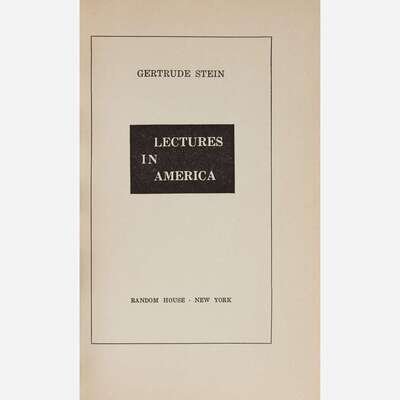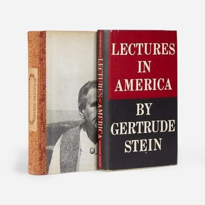 New York: Random House, (1935). First edition. 8vo. 246 pp. Inscribed by Stein on front free endpaper: “For Jerry Leech/for Petaluma Public Library/Gertrude Stein”. Illustrated with photographic frontispiece portrait of Stein. Original first issue beige cloth-covered beveled edged boards, stamped in black and in red; top edge stained dark grey, other edges trimmed; in original unclipped dust-jacket. Wilson A24a