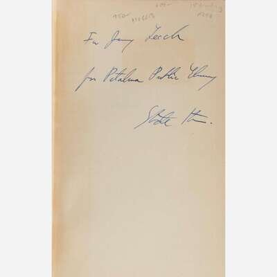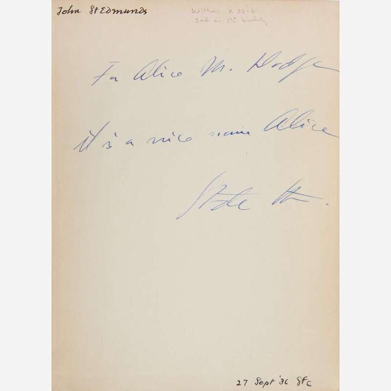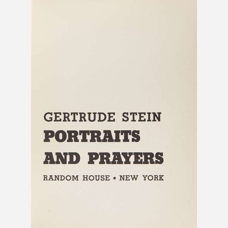 New York: Random House, (1934). Second printing. 8vo. 264 pp. Charmingly inscribed by Stein on front free endpaper: “For Alice M. Dodge (or, Hodge)/it is a nice name Alice/Gertrude Stein,” presumably a reference to her partner Alice B. Toklas. Original first printing quarter brown and maroon cloth over photographic cloth-covered boards, original paper spine label; all edges trimmed; ownership signature of composer John St. Edmunds (1913-86) on front free endpaper, dated September 27, 1936, San Francisco; scarce dust-jacket wanting. Wilson A22b: “At least two copies, however, have been examined by the compiler with the second printing notice, but in the first printing binding.”