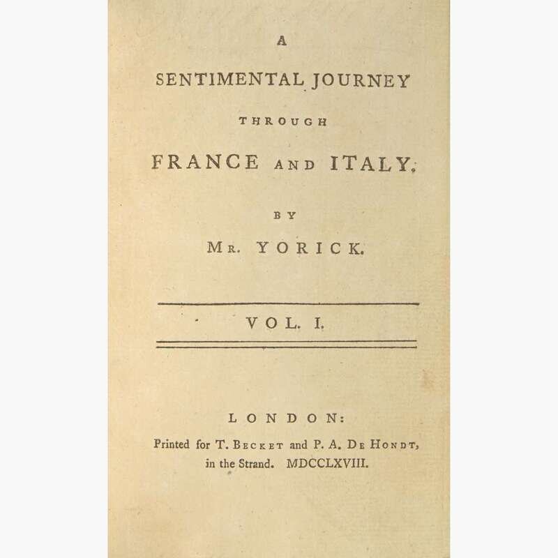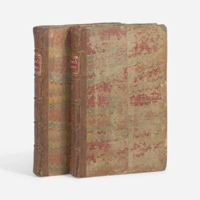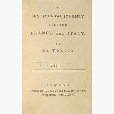 London: Printed for T. Becket and P.A. De Hondt, 1768. In two volumes. First edition; with "vaus" on p. 150 in first volume (later corrected to "vous"); and second volume with pp. 34-35 misnumbered and with "who have" on p. 133. 16mo. xx, (ii) (ad), 203; (iv), 208 pp. With half-titles in each volume, 16 pp. list of subscribers in first volume, the very rare ad leaf in same, and Sterne's engraved armorial crest at p. 38 in second volume. Contemporary quarter brown calf over marbled paper-covered boards, red morocco spine label, stamped in blind and in gilt, second volume expertly and unobtrusively rebacked, boards and extremities lightly worn and rubbed, spine somewhat dry; red speckled edges; a few scattered minor spots to text; short closed tear in top edge of pp. 9/10 in second volume, repaired short closed tear in top edge pp. 15/16 in same; in quarter green morocco slip case and chemise. Rothschild 1971; Grolier, English 54