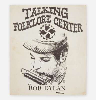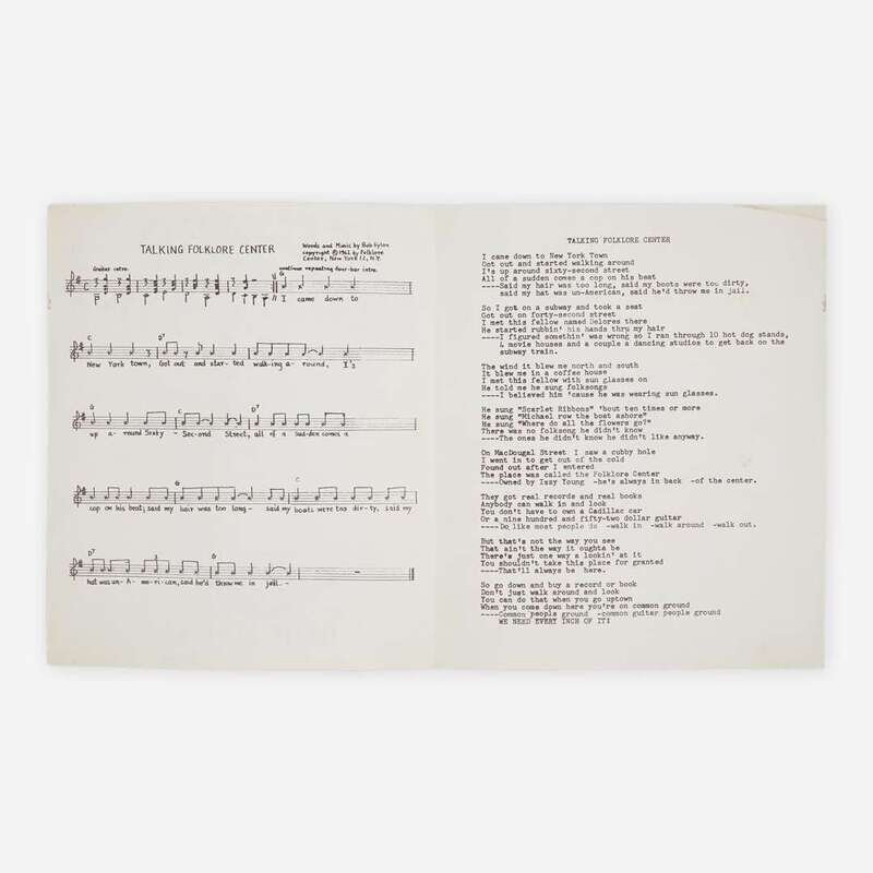 An early and very rare printing of sheet music for Dylan's spoken blues song, "Talking Folklore Center." Dylan wrote the song for Izzy Young (1929-2019), an early champion of the folk singer, and the proprietor of the Folklore Center, a book and record store in Greenwich Village, New York that catered to the folk revival scene. Although the song was never recorded by Dylan, Young had his lyrics and music printed in these small pamphlets, sometime in the months following the release of Dylan's debut studio album, and sold them in his shop for 25 cents. Young opened the Folklore Center in 1957 at the beginning of the folk revival, and Dylan spent hours in the shop, discovering music, listening to records, and chatting with Young. He later referred to the Folklore Center as a "citadel of American folk music."