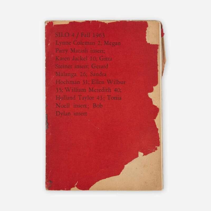 Bennington, Vermont: Bennington College, Printed by the Chapel Press, Williamstown, Massachusetts, 1963. 8vo. 44, (4), 45-57 pp. Edited by Lynne Coleman and Stephanie Spinner. A rare copy of the fourth issue of Bennington College's biannual literary journal, Silo, featuring the first published appearance in any form of Dylan's iconic song, "The Time's They Are a-Changin'" (inserted between pp. 52-53). Illustrated with work by Megan Parry Marash and Tonia Noell, musical score by Gitta Steiner, and literary pieces by Coleman, Karen Jackel, Gerard Malanga, Sandra Hochman, Ellen Wilbur, William Meredith, and Holland Taylor. Original stiff printed red wrappers, heavy loss along extremities of front and rear wrapper, rear wrapper detached but present; text leaves toned, scattered light soiling to same.