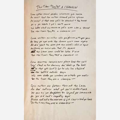 Dylan performed at Bennington College in Vermont for the second time in December 1963 (his first was in October 1961, opening for Reverend Gary Davis). While on campus before the show, Dylan shared handwritten lyrics of his yet-to-be-released song, "The Times They Are a-Changin,'" with poet and student Anne Waldman for inclusion in the college's literary journal, Silo. Dylan had recently wrote and recorded the song earlier that fall, in September-October, and first performed it live, on October 26, at Carnegie Hall. The editors of Silo published a copy of those handwritten lyrics, signed "Me, Bob Dylan," in this Fall issue (under a slightly different title, "The Times They're a Changin"). They are the first published appearance in any form of this iconic song. It would be released on Dylan's third eponymously-named studio album the following January, 1964.
