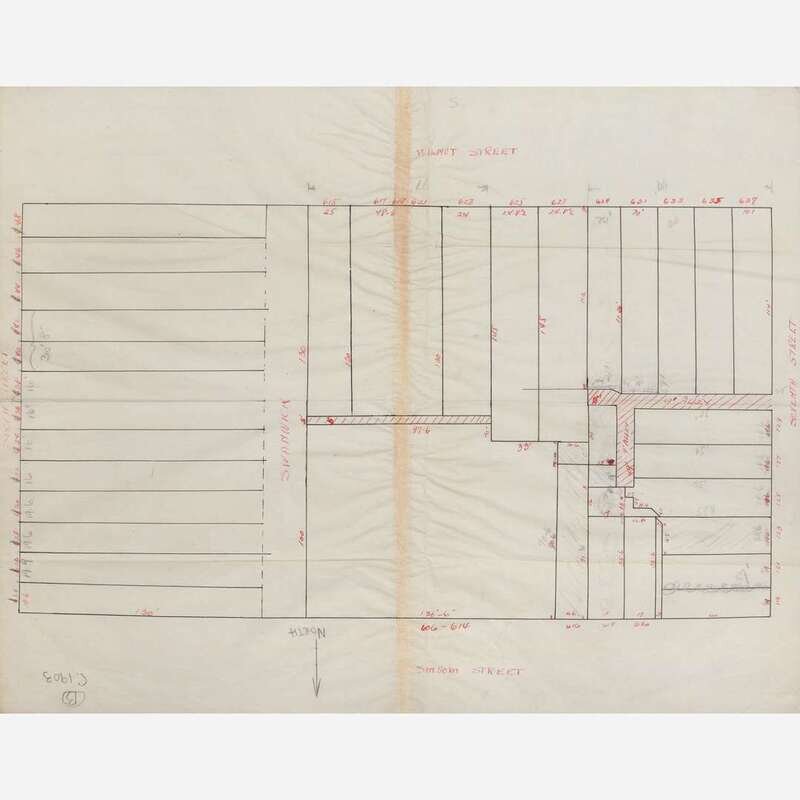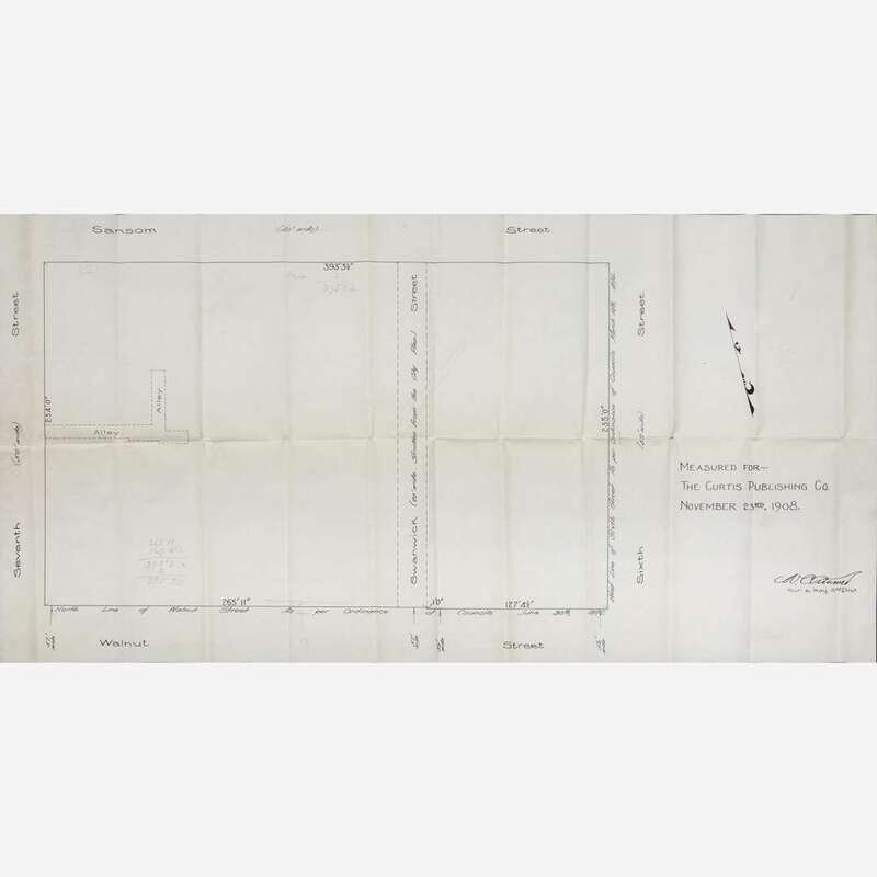 The Curtis Publishing Company was founded in 1891 by Cyrus H. K. Curtis (1850-1933). Through its innovative business model and forays into market research it became one of the largest and most successful publishing companies in the United States in the early 20th-century, and revolutionized the business of magazine publication. It published stalwarts of the time, including The Saturday Evening Post, Ladies' Home Journal, as well as others like The American Home, Jack & Jill, and Country Gentleman. Curtis began acquiring the lots that make up the footprint of the Curtis building in 1900. Included in this archive are two pieces of supplementary documentation pertaining to this, including a large MS. plat map on onionskin, ca. early 1900s, showing the property boundaries that make up the entire footprint prior to construction, as well as a printed survey plan made for the Curtis Publishing Company, entitled: “Measured for The Curtis Publishing Co., November 23, 1908.” The Curtis building was constructed from 1909-11, and was used as the primary headquarters and printing plant for Curtis's publishing empire.