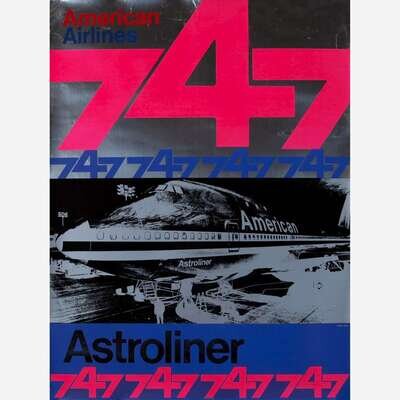 "In January of 1970, a few weeks prior to American Airlines' first Boeing 747 coast-to-coast service, British-born pop artist and real estate developer Peter Gee (1932-2005) completed this introductory poster for the new Boeing 747 that American Airlines called Astroliner. One of the most powerful airline advertising posters of its time, it corresponds with the size and strength of the newly introduced Boeing 747, then the largest commercial airliner in the world by far. The photograph used by Peter Gee to create this poster was part of a series of photos made while American's first Boeing 747 was being tested in the Puget Sound area in late 1969. The original poster is silkscreen printed on silver foil Mylar paper. It is part of the permanent collection of the Museum of Modern Art in New York." (M.C Huhne, Airline Visual Identity, p. 150).