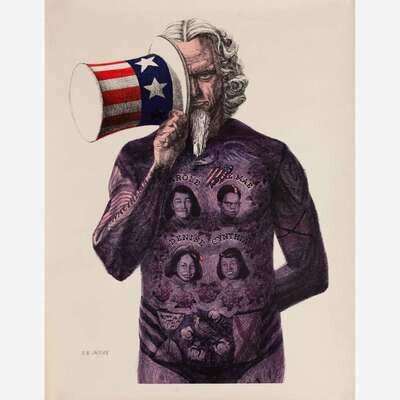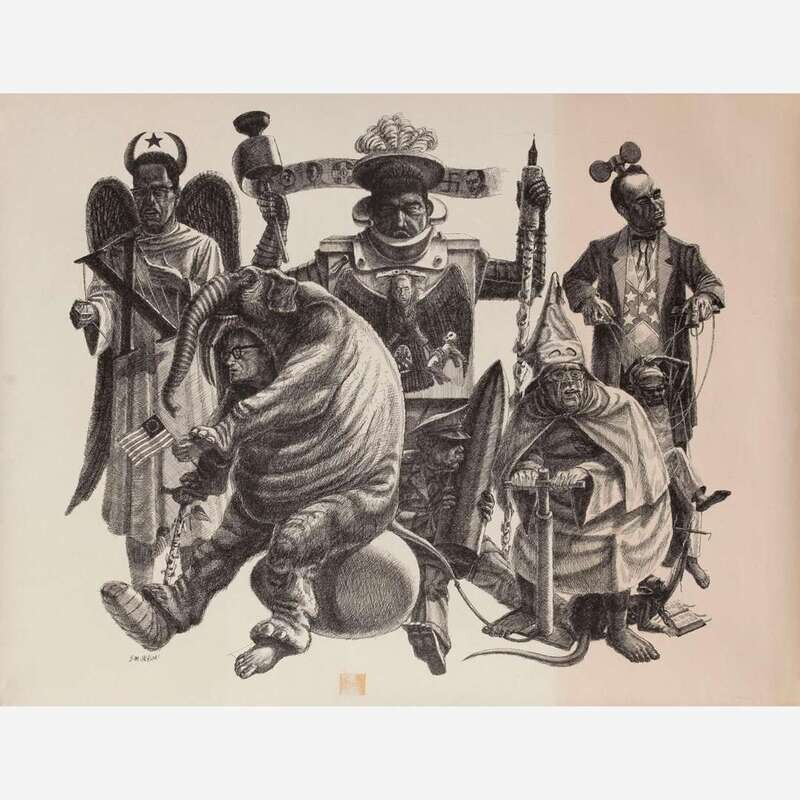 1964. Group of 8 original off-set color and black and white lithographic posters. Comprising: Black Man With Sign Board; Merry Kristmas and Philadelphia; Stars and Bars; The Infernal Triangle; The Prometheus Ballot; The Right Society; The Sovereign Scarecrow; and The Tattooed Man. Each measuring 29 x 22 1/2 in. (737 x 571 mm). Condition varies, with scattered minor wear; some with small tape stains.