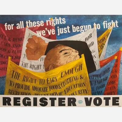 Shahn joined the Political Action Committee of the Congress of Industrial Organizations (CIO-PAC) in 1944 to produce graphic material in support of President Franklin D. Roosevelt's successful presidential re-election campaign. Two years later, in 1946, he again worked with the CIO-PAC to create posters like the above (also see Lots 97 and 99) in support of the Democratic Party and President Harry Truman's administration during the midterm congressional elections, the first following the end of World War II.