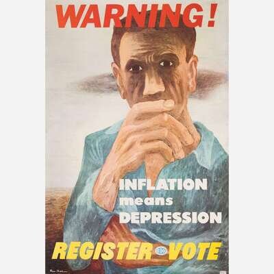 Shahn joined the Political Action Committee of the Congress of Industrial Organizations (CIO-PAC) in 1944 to produce graphic material in support of President Franklin D. Roosevelt's successful presidential re-election campaign. Two years later, in 1946, he again worked with the CIO-PAC to create posters like the above (also see Lots 97 and 98) in support of the Democratic Party and President Harry Truman's administration during the midterm congressional elections, the first following the end of World War II.