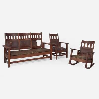 Attributed to Stickley Brothers (American, active 1891-1954) A Settle, Armchair, and Rocking Chair, USA, circa 1905