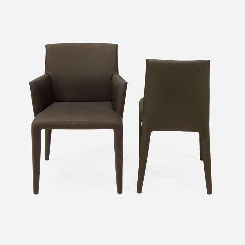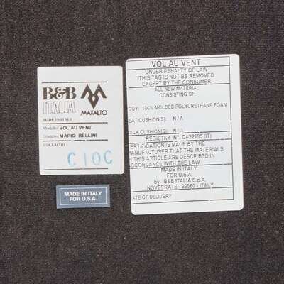 The chairs with a combination of paper labels, including an applied paper label: "Vol Au Vent, Made in Italy" with upholstery information; an applied paper label: "Made in Italy for U.S.A."; and an applied paper label: "B&B Italia, Maxalto, Made in Italy, Modello: Vol Au Vent, Disegno: Mario Bellini"