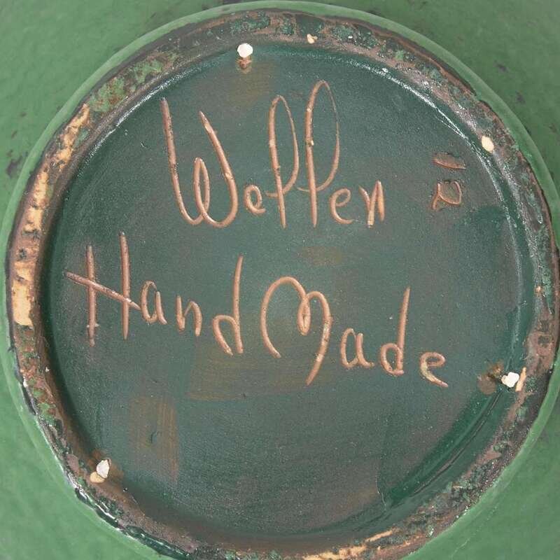 Weller wares marked: the taller concave cylinder vase incised "Weller Ware" to underside; the shorter concave cylinder incised "19, Weller, Hand Made"; the taller amphora vase incised "12, Weller, Hand Made"; the shorter amphora vase incised "188"; the tapered jug vase incised: "A"; one handled bowl incised: "Weller, Hand Made, W"; the other handled bowl with an indistinct marking (either "12" or "N")