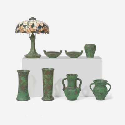 American Art Pottery, etc. Collection of Weller "Coppertone" Vessels, a Hampshire Pottery Lamp, a Floor Vase, and Hanging Shade, USA, early 20th century