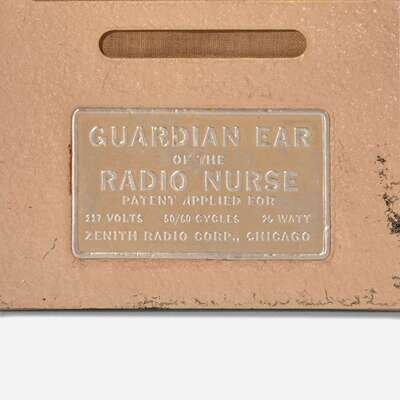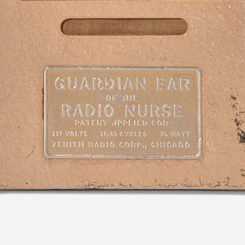 The Guardian Ear with stamped metal information panel: "The Guardian Ear of the Radio Nurse, Patent Applied For, 117 Volts - 50/60 Cycle - 25 Watt, Zenith Radio Corp., Chicago"