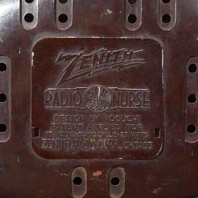 The Radio Nurse with molded information panel: "Zenith Radio Nurse, Design by Noguchi, Patent Applied For, 117 Volts - 50/60 Cycle - 25 Watts, Zenith Radio Corp., Chicago"