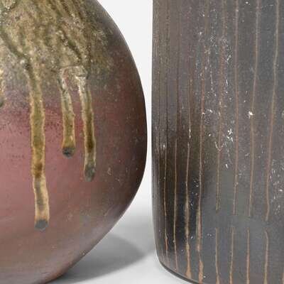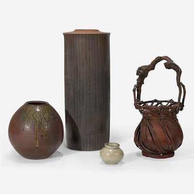 Including a tall Japanese resist-glazed terracotta vase, a Japanese bamboo basket, a Japanese glazed stoneware ovoid vase, and a pale celadon glazed Korean jar.