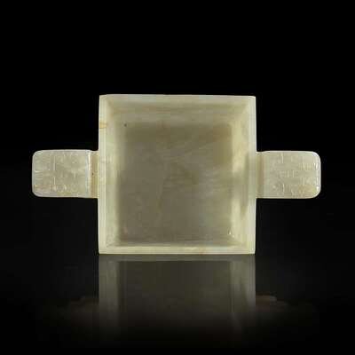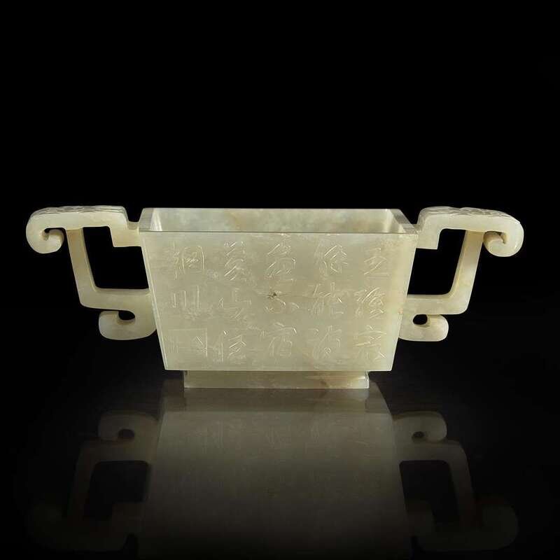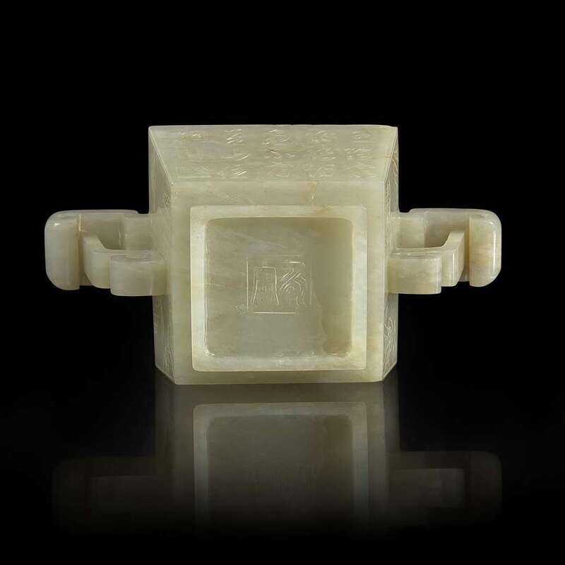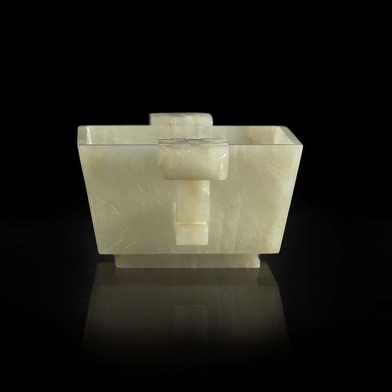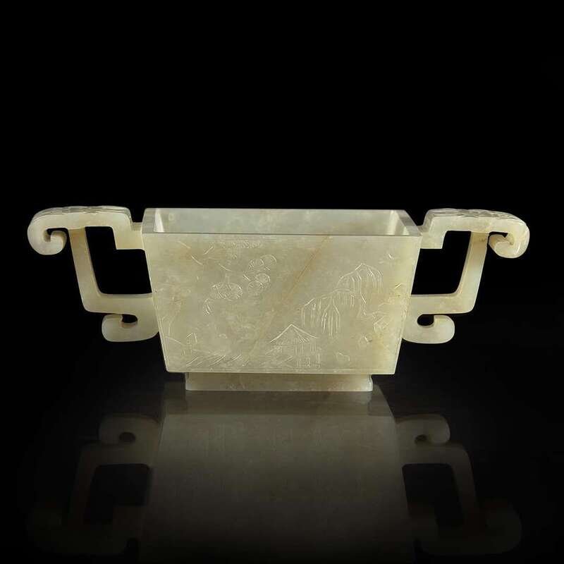 Of tapered "dou" or rice-measure form, three sides carved with landscapes, cleverly incorporating fissures into the design, the fourth with an inscription in low relief and "seal", the tops of the scrolled handles with archaistic masks, the underside with seal, possibly reading "Yongbao", a fine polish overall.