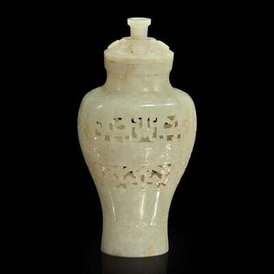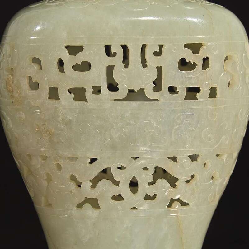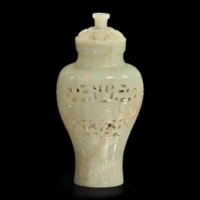 A Chinese carved pale celadon jade reticulated vase and cover 透雕青白玉盖樽 Qing dynasty ?